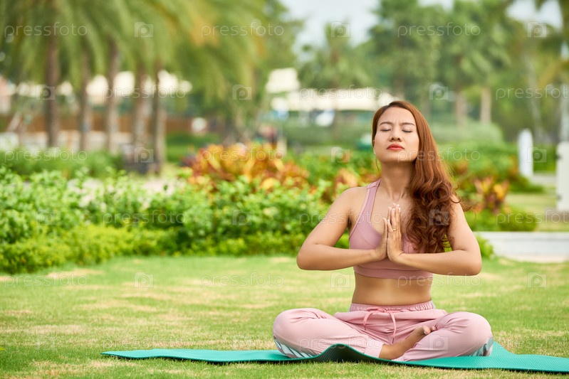 Медитирующая этническая женщина на лугу