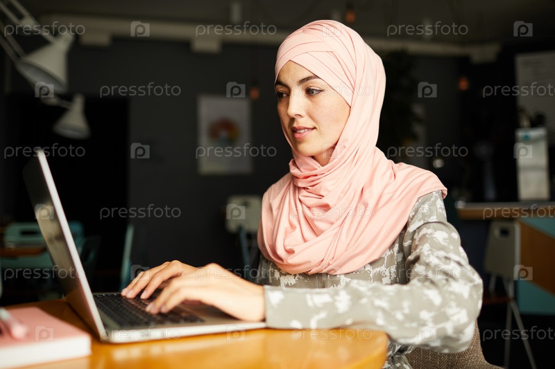 Красивая мусульманская бизнесвумен, работающая за столом в кафе