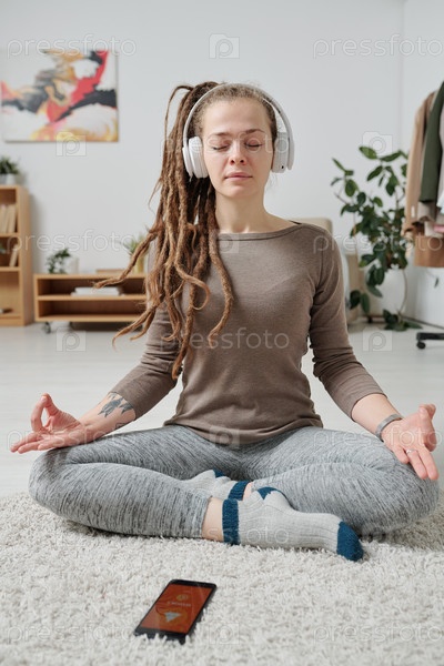 Спокойная девушка в наушниках сидит в позе лотоса и слушает расслабляющую музыку