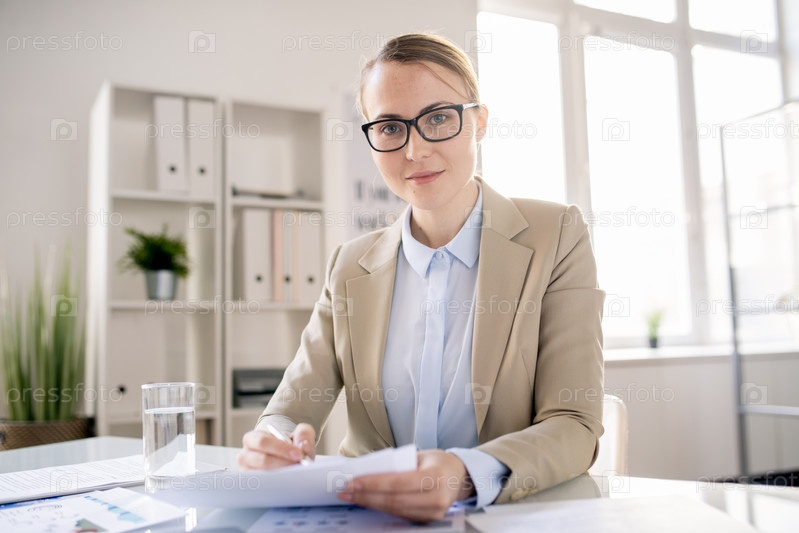 Привлекательный офисный специалист, работающий с отчетом