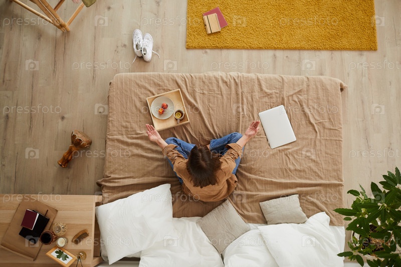 Непосредственно выше вид коричневой девушки в обычном наряде, сидящей со скрещенными ногами и держащейся за руки в мудре во время медитации в постели