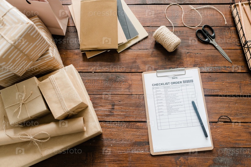Бумага с контрольным списком, ручка, упакованные коробки, нитки, ножницы и куча блокнотов
