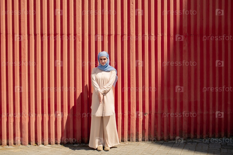 Красивая девушка в хиджабе и повседневной одежде стоит у красной стены