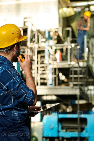 Задний вид молодого рабочего в хардхете, стоящего на фабрике и использующего планшет во время передачи сообщения по радио коллеге