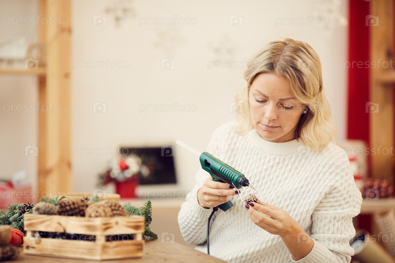 Концентрированная молодая женщина с светлыми волосами, использующая пистолет клей во время нанесения горячего клея на конус, чтобы прикрепить его к рождественскому венку в ремесленной студии