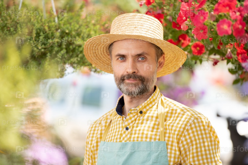 Зрелый садовник в шляпе и фартуке стоит среди цветящих цветов