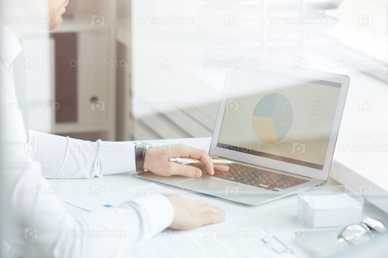 За стеклянным видом занятого менеджера проекта в формальной рубашке, сидящего за столом и использующего ноутбук во время анализа опроса о социальных потребностях