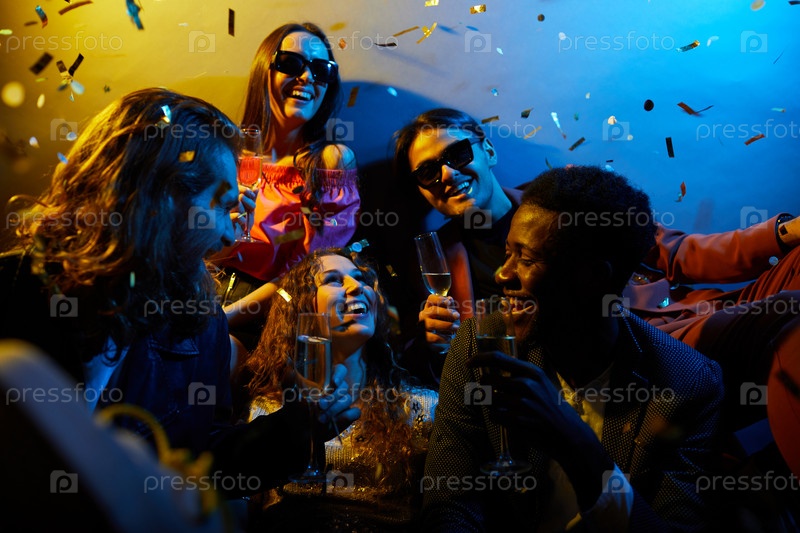 Взволнованные друзья пьют алкоголь и смеются