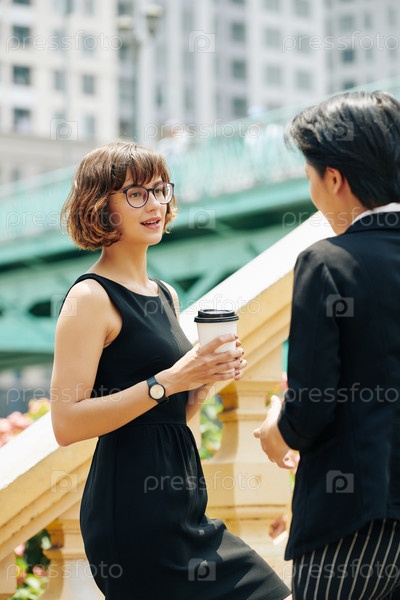 Деловая женщина с чашечкой кофе, разговаривающая с коллегой