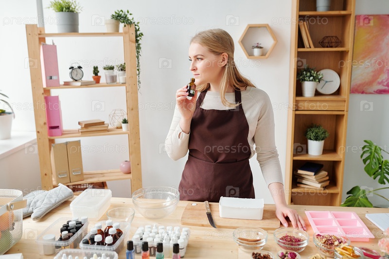 Молодая блондинка-женщина в коричневом фартуке, пахнущая ароматической эссенцией в маленькой бутылке