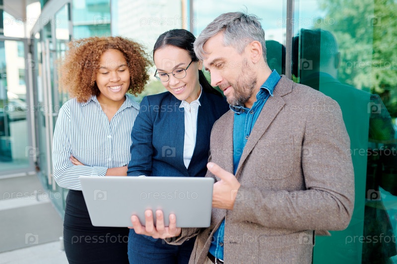 Группа молодых межкультурных менеджеров с ноутбуком готовится к конференции
