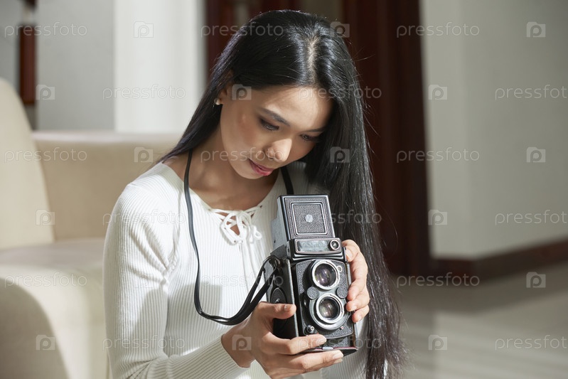 Красивая азиатская женщина проверяет ретро-камеру