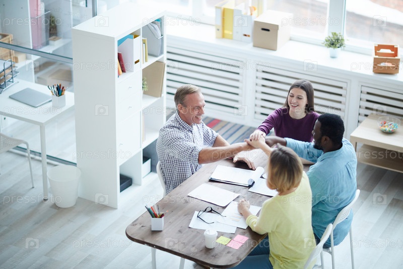 Твердая команда: прямо над видом веселых, взволнованных мультиэтнических коллег, сидящих за столом и обнимающихся руками во время подготовки к тяжелой работе