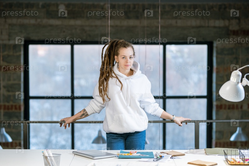 Довольно молодой креативный дизайнер в белой толстовке с капюшоном и синих джинсах стоит в студии