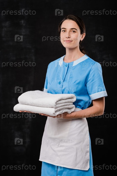 Красивая молодая брюнетка служанка в униформе, держащая два сложенных мягких полотенца