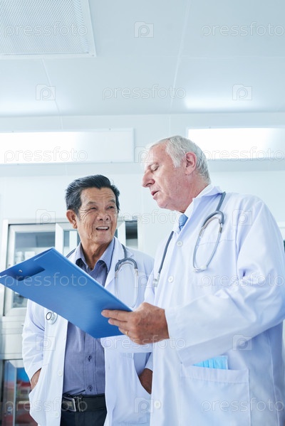 Врач, слушающий коллегу по работе, читающего медицинскую историю