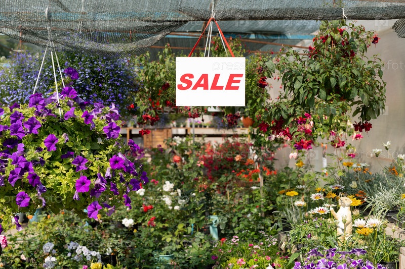 Объявление о продаже на листе бумаги, висящей над разнообразными цветами