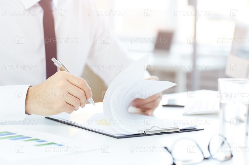 Близкий план неузнаваемого бизнес-дилера, сидящего на рабочем месте и проверяющего информацию о бизнесе в бумагах