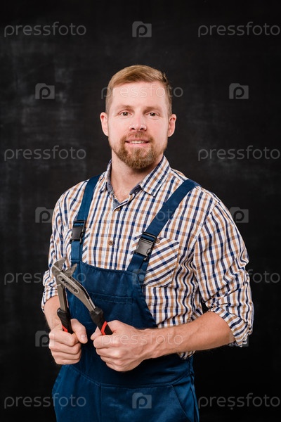 Молодой техник или мастер-ремонтник в рубашке и комбинезонах, использующий инструмент в изоляции