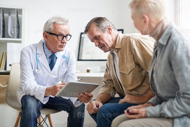 Серьезный старший врач-мужчина в белом пальто с помощью цифрового планшета, анализируя результаты тестов пожилых пациентов после медицинских осмотров
