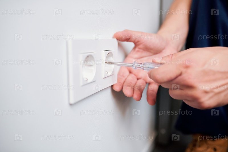Руки молодого профессионального электрика, ремонтирующего или проверяющего напряжение розетки