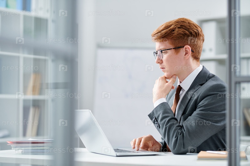 Молодой серьезный аналитик, концентрирующийся на интеллектуальной работе