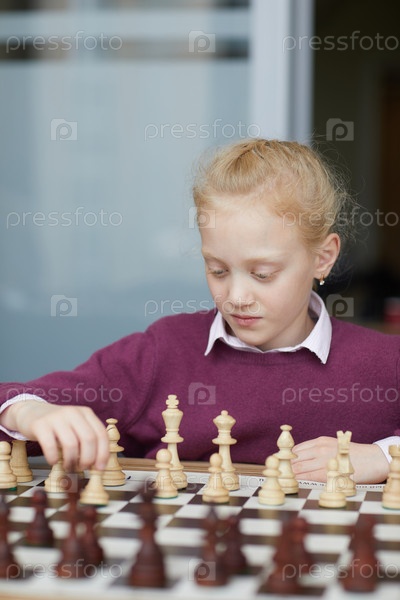 Девушка изучает шахматные фигуры