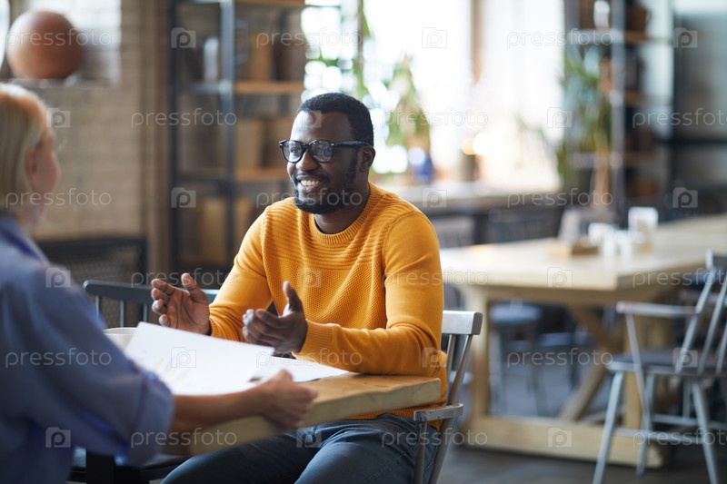 Улыбающийся красивый молодой чернокожий мужчина в ярком свитере сидит за столом и жестикулирует руками, представляя свою идею коллеге