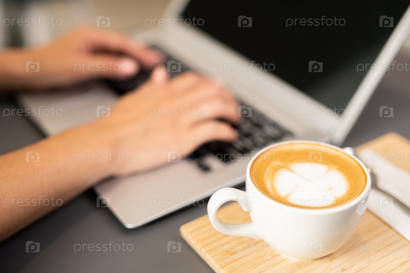 Чашка капучино на деревянной подносе рядом с руками студентки, печатающей