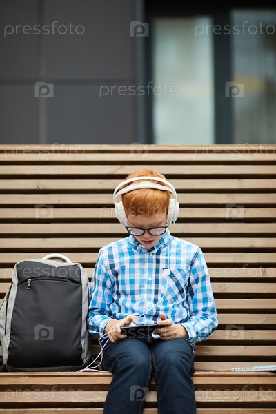 Мальчик отдыхает на скамейке снаружи
