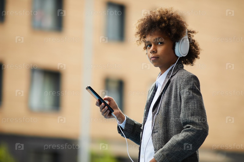 Африканский мальчик с мобильным телефоном на улице