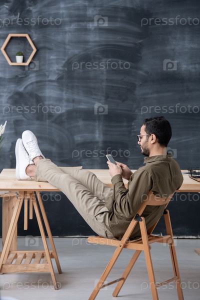 Молодой случайный сотрудник держит ноги на столе, прокручивая смартфон