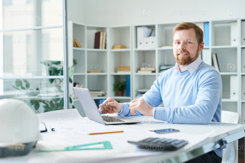 Портрет оптимистичного красивого молодого менеджера по строительству в голубом свитере, сидящего за столом и использующего ноутбук при взгляде на камеру в современном офисе