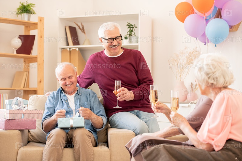 Два счастливых пожилых человека и их жены наслаждаются домашней вечеринкой