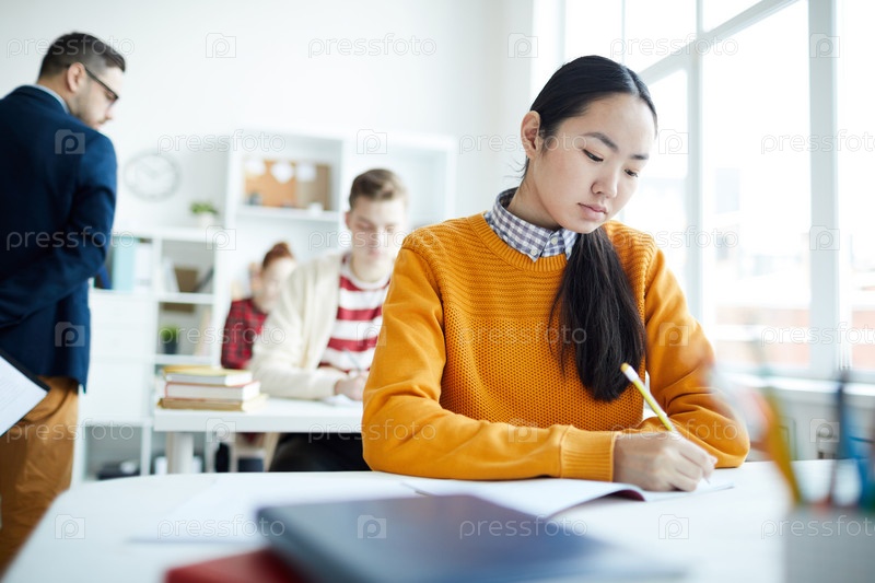 Серьезно привлекательная азиатская студентка с пониным хвостом сидит за столом в классе и пишет резюме на лекции