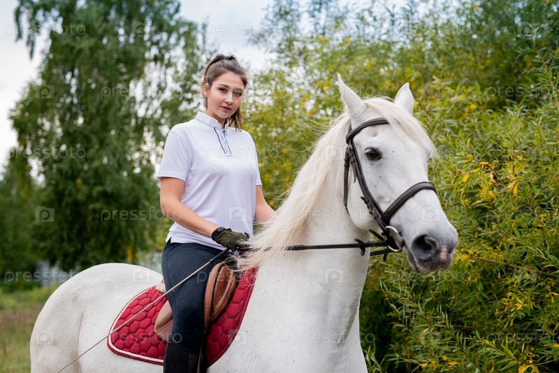 Красивая девушка смотрит на тебя, сидя на спине белой чистокровной гоночной лошади