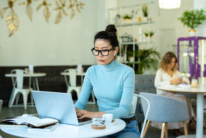 Красивая молодая случайная женщина с беспроводными наушниками, печатающая перед ноутбуком