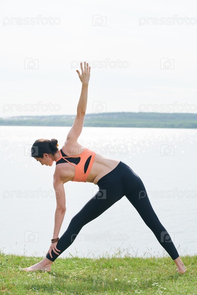 Doing extended triangle pose Выполняя позу расширенного треугольника