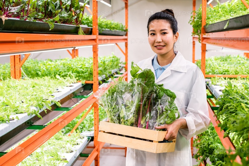 Красивая азиатская женщина-агроном с упакованной свежей органической пищей, движущаяся вдоль прохода