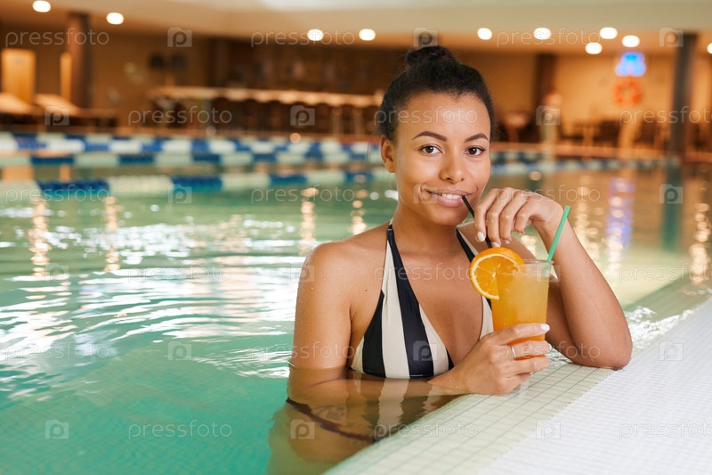 Женщина смешанной расы наслаждается коктейлями в бассейне