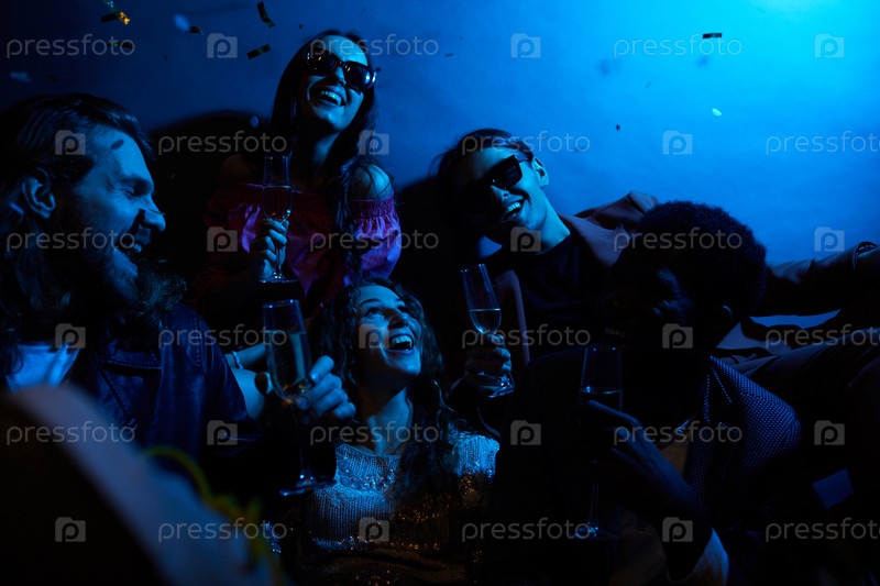 Позитивные друзья пьют шампанское в темной комнате с голубым светом