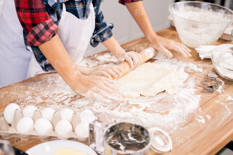 Руки молодой женщины и ее сына в фартуках качают тесто на деревянном столе