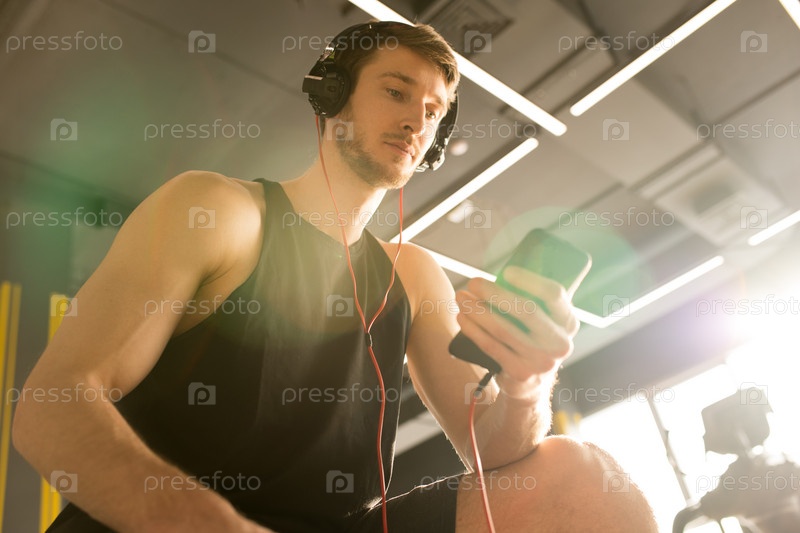 Молодой спортсмен использует телефон во время тренировок