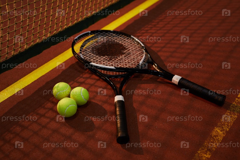 Близкий план теннисных ракет соперников и деревянных теннисных мячей, лежащих в тени сетки на корте, концепция рекреационной игры