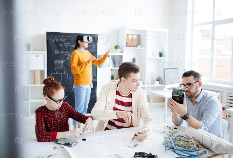 Серьезный молодой ИТ-инженер в очках сидит за столом с чертежами и проводами и учит студентов собирать материнскую плату на уроке