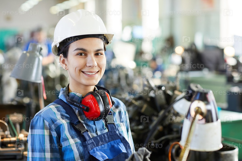 Улыбающаяся уверенная девушка с рабочим шлемом, которая носит защитники ушей на шее и смотрит в камеру, она работает на часовой фабрике