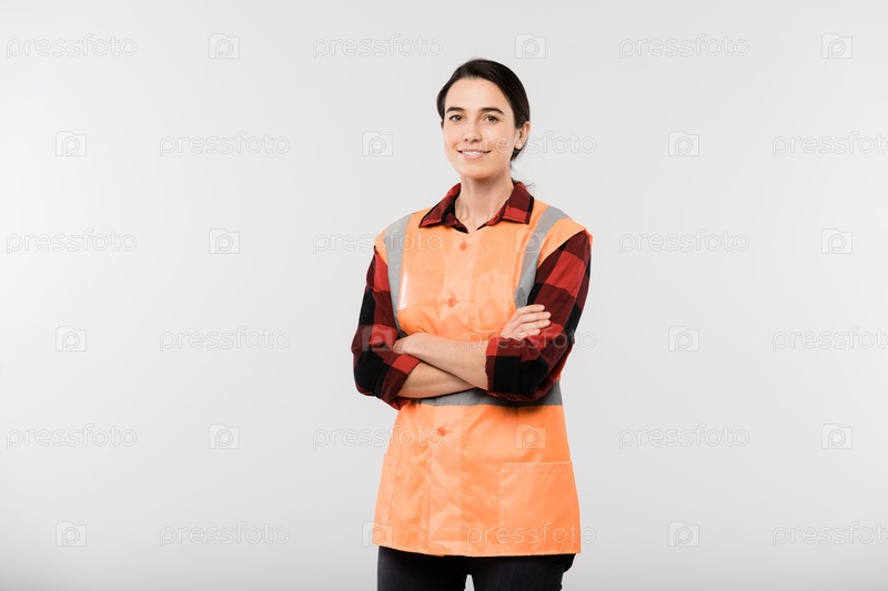 Счастливая молодая инженерка в рабочей одежде и оранжевом куртке, скрестившая руки за грудь