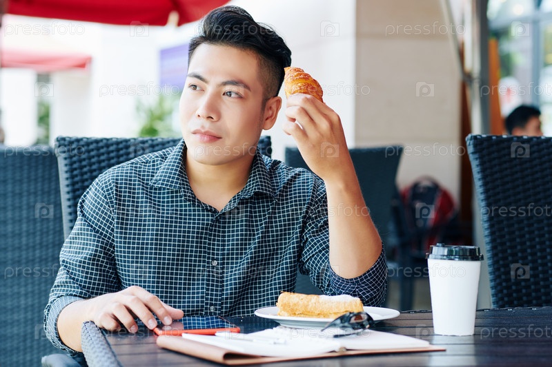 Вьетнамский мужчина наслаждается кофе и выпечкой