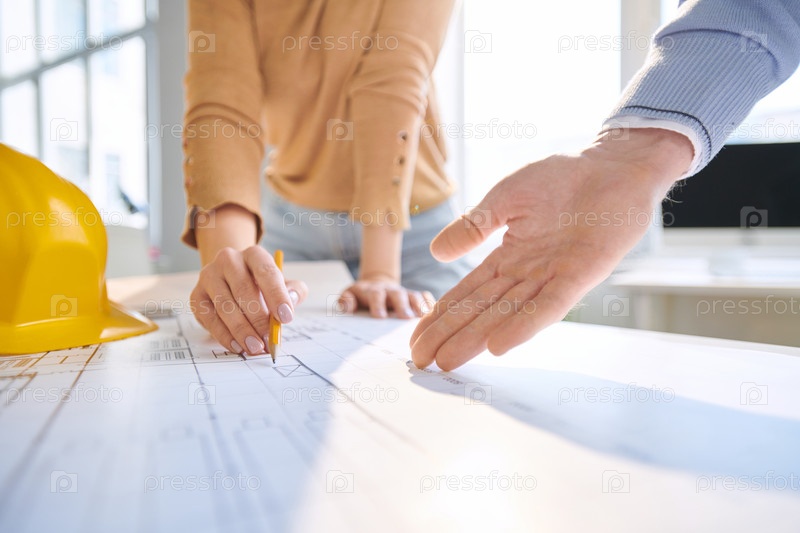 Близкий план неузнаваемых строительных инженеров, обсуждающих чертежи: мужчина указывает на эскиз во время объяснения идеи проекта