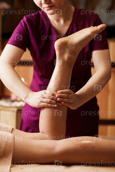 Концентрированный квалифицированный массажист в коричневой форме, массирующий ногу женщины во время шведского массажа в салоне красоты
